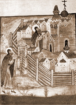 | Изображение Снетогорского монастыря на иконе Четерых Святителей (нач. XVII в., собрание Псковского государственного музея-заповедника). Фрагмент. |
